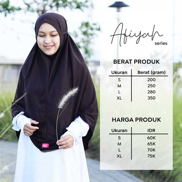 "AFIYAH SERIES" adalah khimar instan non pad yang memiliki jahitan di tepi yang nggak bikin pad nya mudah lepek dan menggunakan tali dikedua sisi padnya. Cara pakainya simple banget deh, tinggal slup, dan diikat bagian talinya, pokoknya praktis dan gampang banget dipakai.